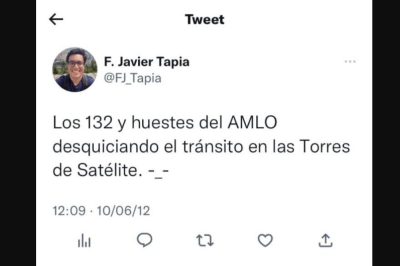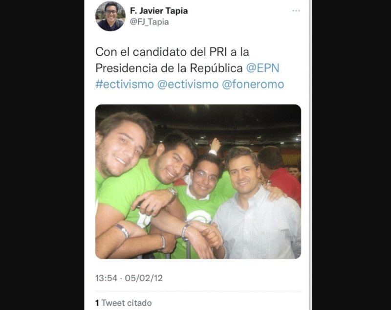De acuerdo con usuaria Camila Martínez compartió algunos mensajes en redes sociales de F. Javier Tapia; quien en 2012 apoyó de forma abierta al candidato del PRI, Enrique Peña Nieto.