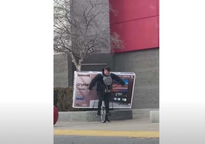 Un hombre se volvió viral en redes sociales y dejó sorprendidos a decenas de usuarios por un video donde se aprecia que salió de una tienda Target, en Estados Unidos, con una pantalla de 75 pulgadas, pero en lugar de pedir un transporte para llevársela a casa, se amarró la televisión en la espalda con una cuerda y se la llevó a bordo de un monociclo.