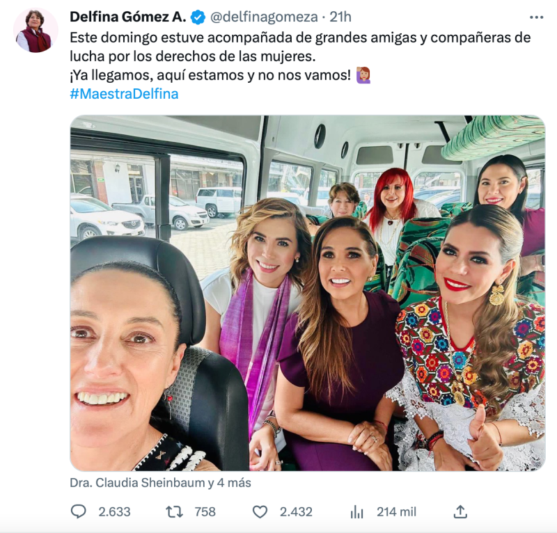 “Este domingo estuve acompañada de grandes amigas y compañeras de lucha por los derechos de las mujeres. ¡Ya llegamos, aquí estamos y no nos vamos! ??????????? #MaestraDelfina”, escribió la maestra Delfina Gómez en sus redes.