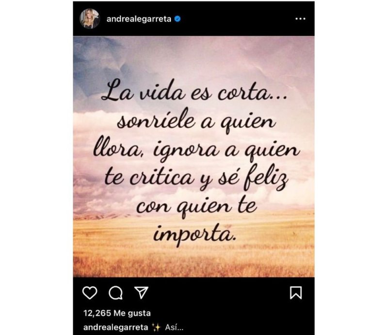 Fue a través de su perfil oficial de Instagram donde Andrea Legarreta publicó el mensaje que causó una gran controversia entre sus seguidores pues dicha publicación se trató de una imagen que contenía una frase que hace alusión a aprovechar la vida disfrutando con las personas que se quiere e ignorando a las que critican, no obstante, de inmediato se comenzó a especular que dicho post era una indirecta para el padre de sus hijas.
