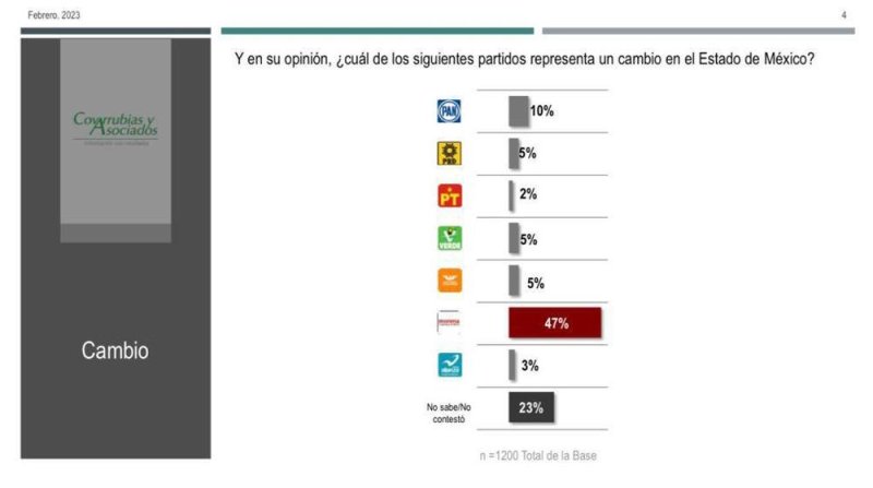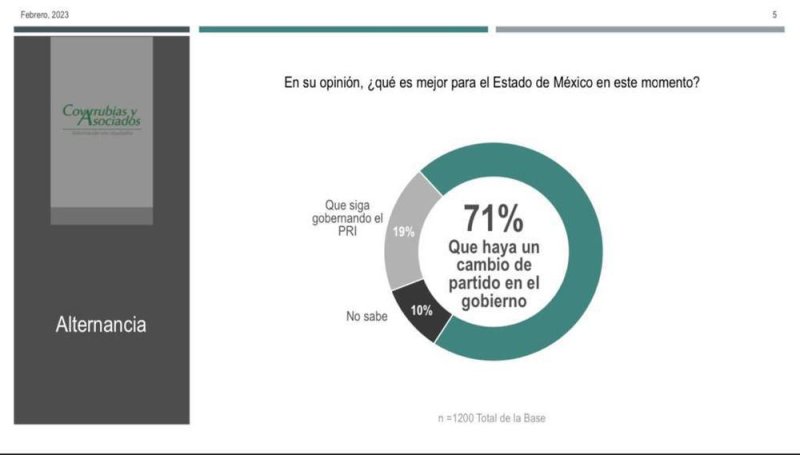 En la encuesta publicada el 10 de marzo por Covarrubias y Asociados, a la pregunta “En su opinión, ¿qué es mejor para el Estado de México en este momento?”, el 71 por ciento de las personas encuestadas contestó “Que haya un cambio de partido en el gobierno”; el 19 por ciento contestó que se mantenga como está, mientras que el 10 por ciento dijo que “no sabe”.