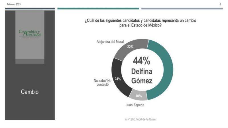 De igual forma, se preguntó “¿Cuál de los siguientes candidatos y candidatas representa un cambio para el Estado de México?” a lo que el 44 por ciento de las personas muestreadas respondió que la maestra Delfina Gómez.