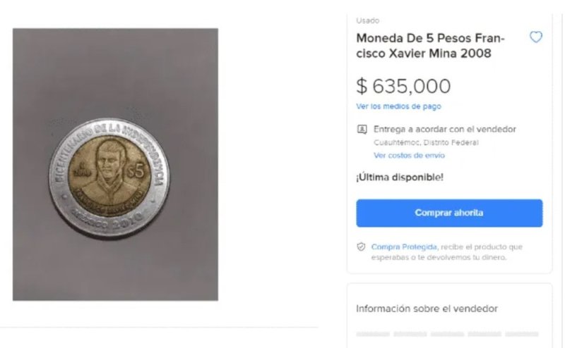 Así es el caso de la moneda de 5 pesos conmemorativa, la cual de acuerdo al vendedor, cuenta con una serie de características que la hacen adquirir un valor de 635 mil pesos mexicanos en internet.