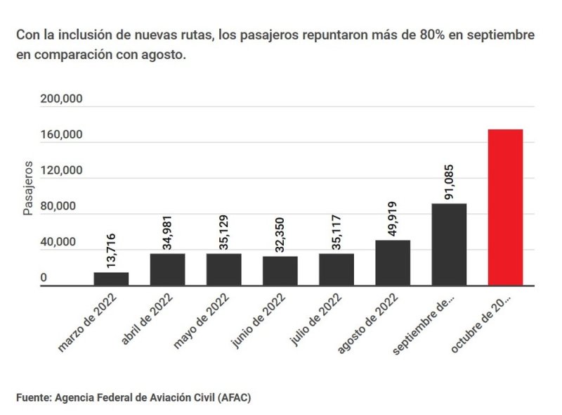 El promedio de pasajeros diarios en el AIFA también se elevó, al pasar de 3,036 usuarios a 5,609 pasajeros durante octubre.