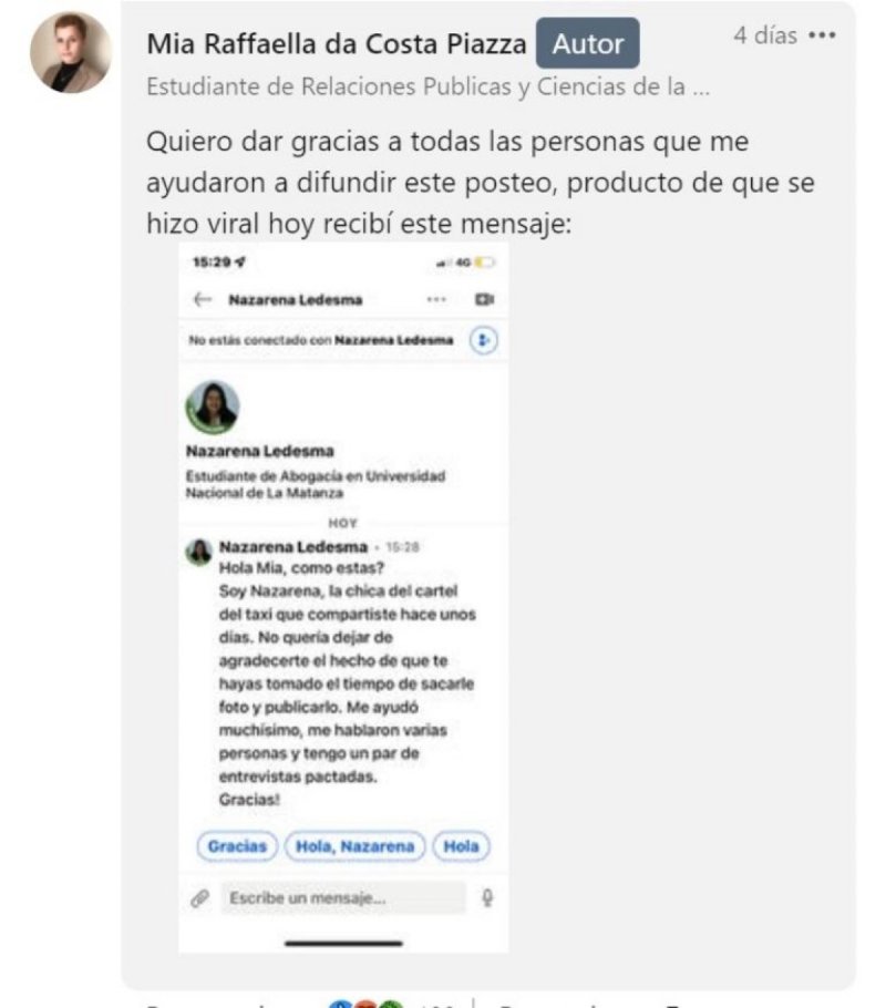 "Hola Mia, ¿cómo estas? Soy Nazarena, la chica del cartel del taxi que compartiste hace unos días. No quería dejar de agradecerte el hecho de que te hayas tomado el tiempo de sacarle foto y publicarlo. Me ayudó muchísimo, me hablaron varias personas y tengo un par de entrevistas pactadas. Gracias", se puede leer en el mensaje.