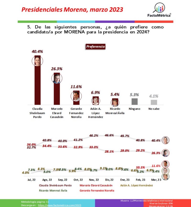 Según los datos recabados por FactoMétrica, la actual Jefa de Gobierno de la Ciudad de México encabeza las preferencias con un contundente 40.4%, lo que la consolida como la favorita para representar a Morena en la próximas elecciones presidenciales. Pero, ¿qué hay del resto de los contendientes?