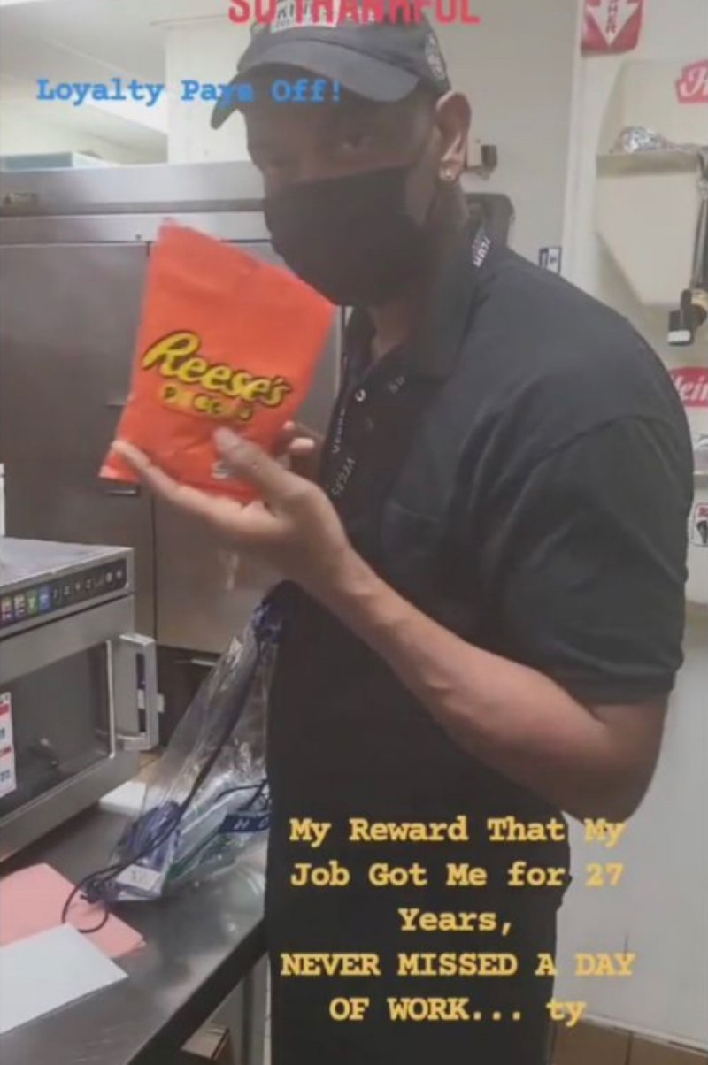 En su video el empleado explicó que durante sus 27 años de trabajo no ha faltado un solo día y como recompensa le dieron un kit en una bolsa de plástico transparente que contenía un boleto para el cine, unos chocolates Reeses, un vaso, dos plumas azules y dos paquetes de pastillas Live Savers.
