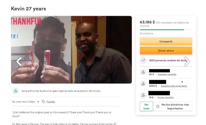 Sin embargo, luego del revuelo que causó su video, su hija llamada Seryna decidió organizar una recaudación en GoFundMe debido a que había muchas personas interesadas en ayudar a su padre y hasta el momento ya han juntado 63 mil dólares (un millón 260 mil pesos).