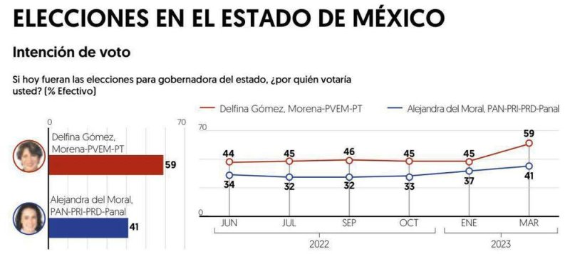 Con el 59 por ciento en dicha encuesta, la maestra Delfina Gómez tiene una ventaja de 18 puntos sobre Alejandra del Moral, quien cuenta con el 41 por ciento de la intención de voto.