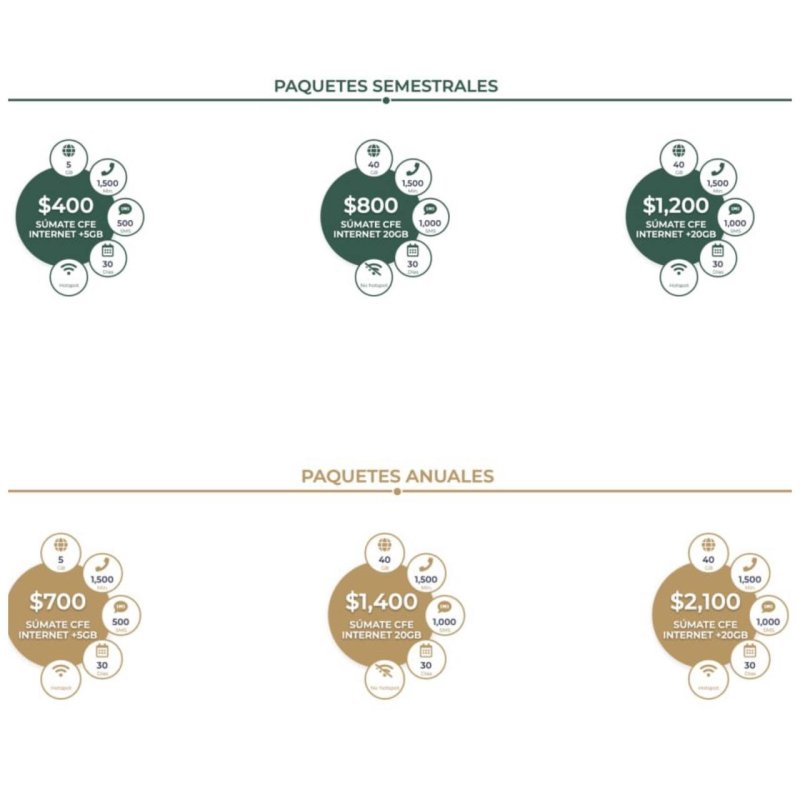 El primero es de 400 pesos, este tiene 5 gigas de internet, 1,500 minutos y 500 mensajes además de compartir internet con otros dispositivos por 30 días seis meses.