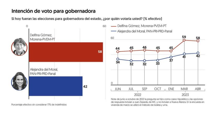 El estudio arrojó una intención de voto que favorece a Delfina Gómez con 58 por ciento, mientras que Alejandra del Moral obtuvo 42 por ciento, una diferencia de 16 puntos, poca variación respecto al sondeo anterior, realizado en marzo, cuando la ventaja de la morenista era de 18 puntos.