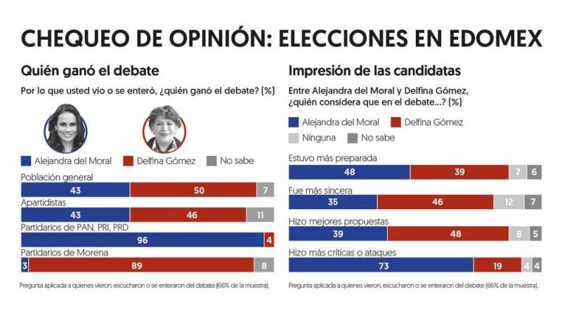 Una encuesta de El Financiero indica que 50 por ciento de los entrevistados que siguieron el debate dio por ganadora a Delfina Gómez y 43 por ciento, a Alejandra del Moral. Entre el segmento de apartidistas, que representa 53 por ciento del electorado estatal, 46 por ciento mencionó como ganadora a la morenista y 43 por ciento a la abanderada de la alianza PAN-PRI-PRD-Panal, prácticamente un empate, si se considera el margen de error de la encuesta.