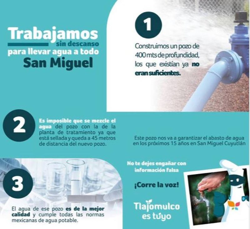 El alcalde afirmó en sus cuentas de redes sociales que con la intención de mejorar el abasto de agua, se construyó un pozo de 400 metros que distribuirá 70 litros por segundo para beneficiar a los habitantes de San Miguel Cuyutlán, Nuevo San Miguel, San Diego, Cuexcomatitlán, San Juan y San Lucas Evangelista.