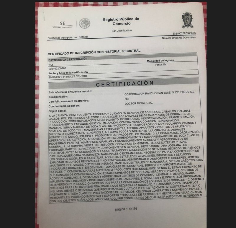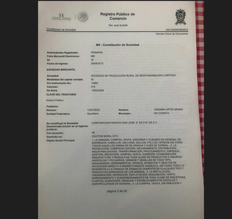 Un documento del Registro Público de Comercio de San José Iturbide, Guanajuato –del cual Contralínea posee copia– da cuenta de la estructura de la empresa utilizada en los supuestos fraudes. Fechado el 8 de octubre de 2018, consigna la realización el 27 de julio de ese año de una asamblea ordinaria y otra extraordinaria para actualizar la representación de Corporación Rancho San José, SPR de RL de CV.