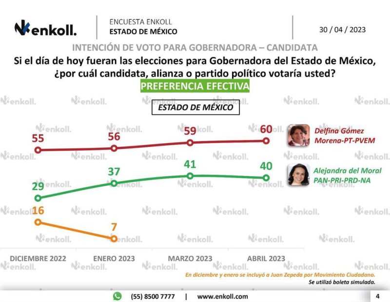 De acuerdo con la encuesta de Enkoll, publicada por El Universal, la candidata morenista Delfina Gómez tiene una intención de voto de 60%, frente a 40% a la priista, es decir, tiene una ventaja de 20 puntos porcentuales.