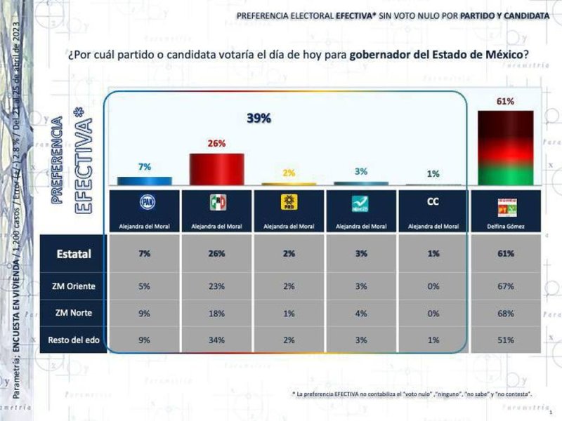 Por otra parte, según la última encuesta levantada por la empresa Parametría que fue publicada en La Jornada, si en este momento fueran las elecciones en el Estado de México, la maestra Delfina Gómez ganaría ampliamente, ya que 61% de los encuestados afirmaron que votarían por ella, contra 39% de Del Moral Vela, una ventaja de 22 puntos.