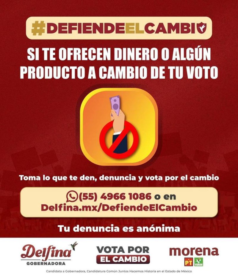 En la página web Delfina.mx/DefiendeElCambio y través del número de Whatsapp 55 4966 1086, la ciudadanía podrá hacer llegar sus denuncias por guerra sucia, compra del voto y extorsión.