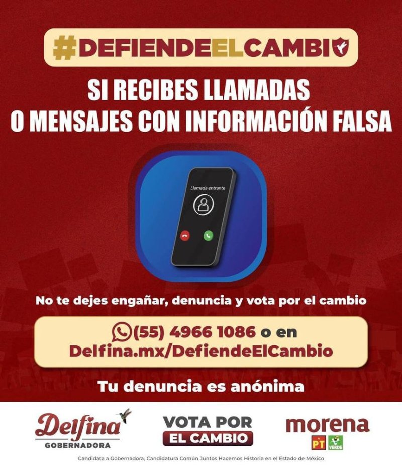 En redes sociales y en supuestos medios de comunicación han circulado mentiras e información engañosa (fake news) con el objetivo de ensuciar la elección en el Estado de México. Las noticias falsas, la propaganda de ataque, las fotos y videos con información falsa, así como mensajes con mentiras pueden ser denunciados en Delfina.mx/DefiendeElCambio y través del número de Whatsapp 55 4966 1086.