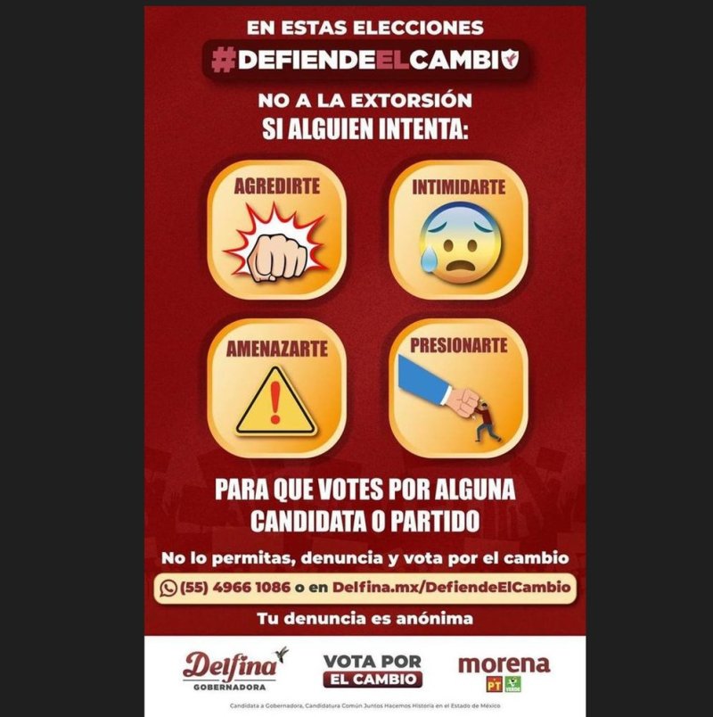 Las y los ciudadanos no pueden ser intimidados, presionados, amenazados o agredidos para llevar a cabo actos a favor o en contra de alguna candidata. Cualquier intento de extorsión debe denunciarse y se puede realizar en Delfina.mx/DefiendeElCambio y en el número de Whatsapp 55 4966 1086.