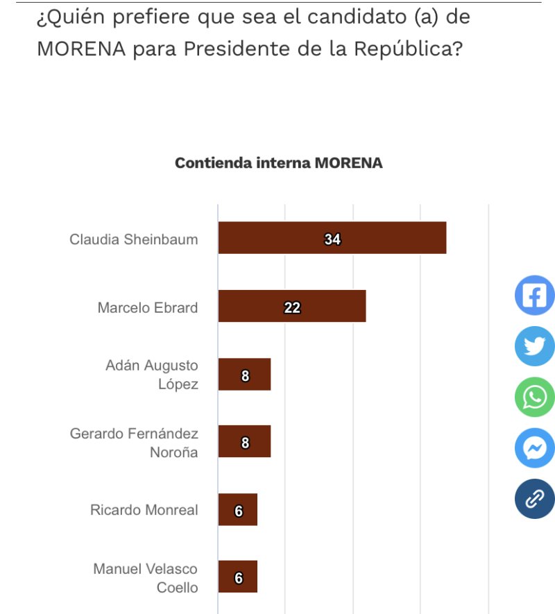 Claudia Sheinbaum lidera las preferencias en la pregunta de quién de los seis aspirantes debería ser la o el candidato de Morena y su coalición para la Presidencia de la República. Un 34% prefiere que Sheinbaum sea la candidata de Morena, mientras que 22% prefiere a Ebrard. Los demás aspirantes registran cifras entre 6% y 8%. Es importante destacar que dependiendo de las reglas de selección, esta pregunta podría ser decisiva en la definición de la candidatura de Morena.