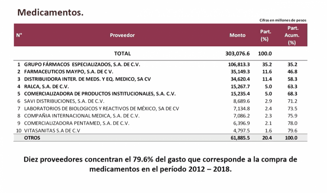 En el listado dado a conocer por el Jefe del Ejecutivo está encabezado por la empresa Grupo Fármacos Especializados S.A. de C.V. quien dominaba el 35.2% del mercado. Por lo que López Obrador señaló que en el sexenio de Enrique Peña Nieto, una mafia controlaba el mercado farmacéutico.