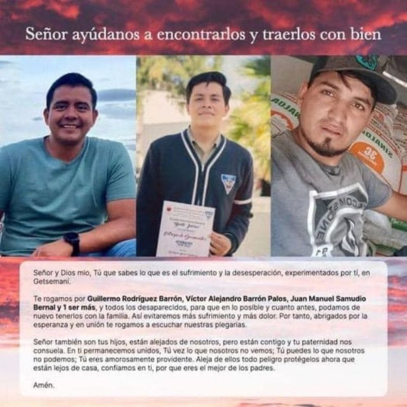 “Gracias a todos los que se unieron a este acto de amor fe y esperanza, todos pudimos sentir esa energía que indudablemente llegó hasta donde están, la misma que los traerá de vuelta pronto sanos y salvos por Víctor Alejandro Barrón Palos Guillermo Rodríguez Barrón Juan Manuel Zamudio Bernal, el joven del que desconocemos su nombre y todos los que nos faltan. No descansaremos hasta encontrarlos sanos y salvos”, escribió una de las familiares en Facebook.