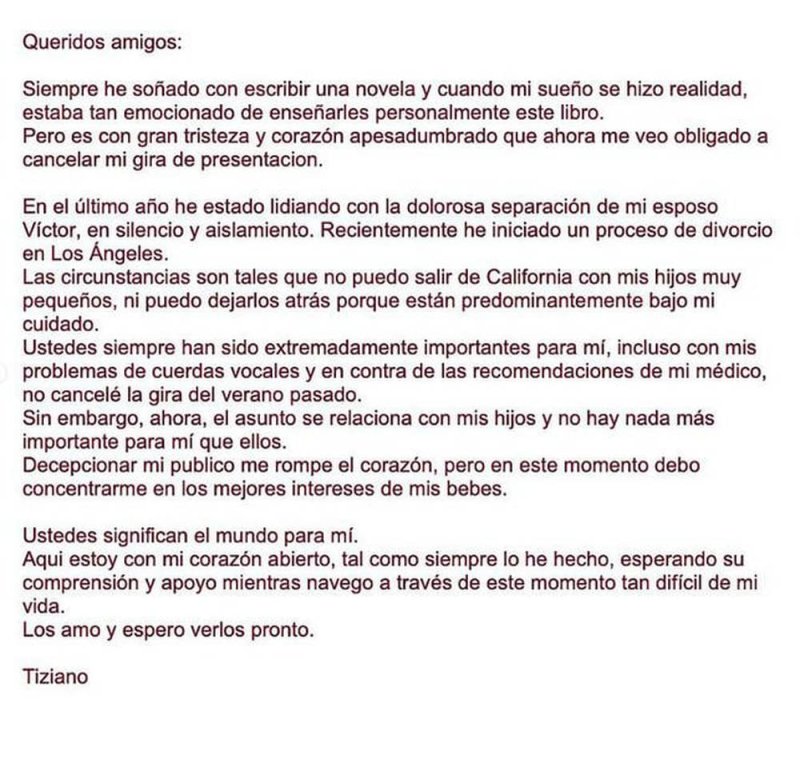 A través de un extenso comunicado en tres idiomas, Tiziano puntualizó que ha anulado todos sus compromisos pues su prioridad es estar con sus dos hijos que no puede llevar a Italia.