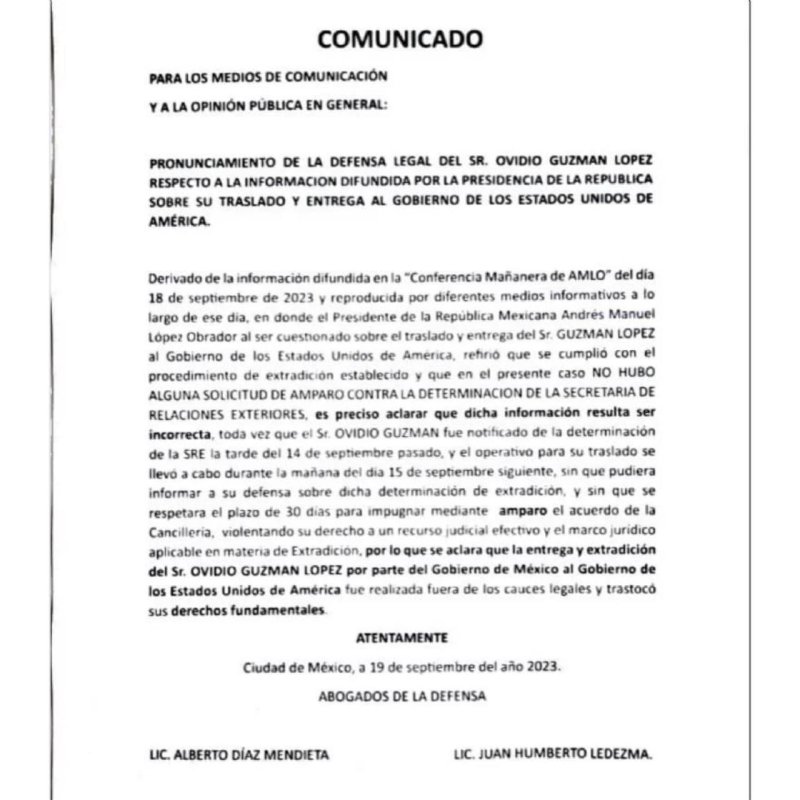 "La entrega y extradición del Sr. Ovidio Guzmán López por parte del Gobierno de México al Gobierno de Estados Unidos de América fue realizada fuera de los causes legales y trastocó sus derechos legales", señaló mediante un comunicado.