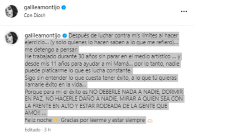 “Sigo sin entender lo que cuesta tener éxito, a lo que tú quieras llamarle éxito en la vida… Porque para mí el éxito es NO DEBERLE NADA A NADIE, DORMIR EN PAZ, NO HACERLE DAÑO A NADIE, MIRAR A QUIEN SEA CON LA FRENTE EN ALTO Y ESTAR RODEADA DE LA GENTE QUE AMO… Feliz noche. Gracias por leerme y estar siempre”, concluyó su declaración Galilea.