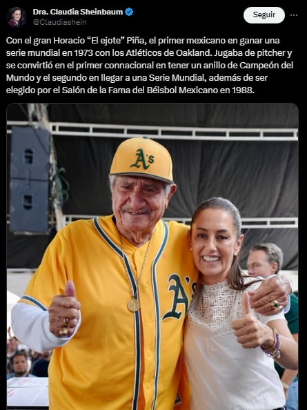 “Con el gran Horacio ‘El ejote’ Piña, el primer mexicano en ganar una serie mundial en 1973 con los Atléticos de Oakland. Jugaba de pitcher y se convirtió en el primer connacional en tener un anillo de Campeón del Mundo y el segundo en llegar a una Serie Mundial, además de ser elegido por el Salón de la Fama del Béisbol Mexicano en 1988?, redactó.