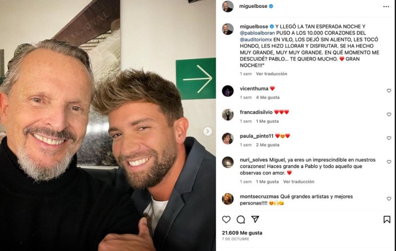 La fuente reveló a TV Notas que Miguel Bosé y Pablo Alborán se conocieron en 2012 cuando invitó al cantante de ‘Saturno’ a formar parte de su álbum ‘Papitwo’, posteriormente cantaron en Viña del Mar un año después y en 2016 formó parte de un ‘MTV Unplugged’.