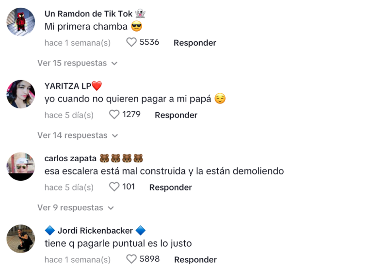 Los internautas hablaron acerca de lo ocurrido, con una división de opiniones sobre la acción cometida por el hombre, pero también de la persona que le paga, entre los que destacan: “No pudo esperar hasta mañana, al final los dos pierden, es muy impulsivo”; “Mi primera chamba”; “Esa escalera está mal construida y la están demoliendo”; “Tienen que pagarle puntual, es lo justo”.