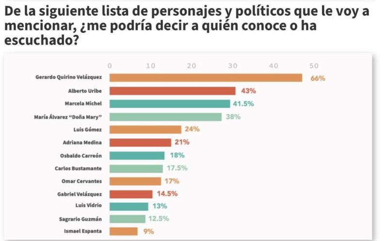 En un segundo bloque de personalidades conocidas en el municipio, destacan la coordinadora Adriana Medina (21 por ciento), el Síndico Osbaldo Carreón (18 por ciento), y el Regidor Juan Carlos Bustamante (17.5 por ciento), entre otros.