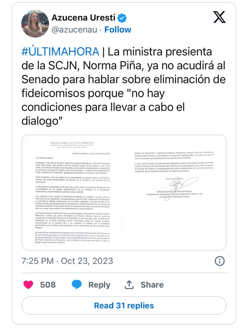 Norma Piña dejó clara su postura de no acudir al Senado, aunque precisó que el pasado sábado recibió una invitación del senador Alejandro Rojas Díaz Durán, para acudir el martes 24 de octubre a las 10:00 horas al sede de la Senado para exponer sus planteamientos sobre la minuta con proyecto de decreto que busca extinguir 13 fideicomisos del Poder Judicial de la Federación.