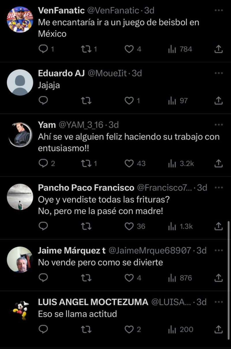 El video se volvió viral en redes sociales, consiguiendo 637.2 mil reproducciones, ocho mil 834 corazones y casi 100 comentarios, donde los usuarios dejaron sus opiniones al respecto, entre los que destacan: “la señorita de verde en su casa manifestando ser famosa algún día -El universo: no se diga más”; “Y nadie le compró un chicharrón, se pasan de lanza”; “Ahí se ve alguien feliz haciendo su trabajo con entusiasmo”; “No vende pero como se divierte”.
