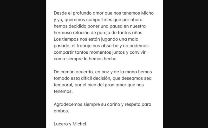 El 12 de julio de este 2023, a través de un comunicado en su cuenta de Instagram, Lucero y Michel Kuri anunciaron que se separarían desde el amor por cuestiones laborales.