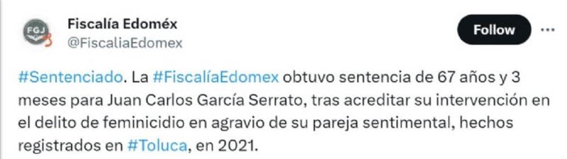 Por medio de un comunicado, la Fiscalía estatal explicó que tras revisar las pruebas recabadas por el agente del Ministerio Público, se comprobó la participación de García Serrato en el feminicidio que ocurrió el 2 de julio de 2021 en el municipio de Toluca, Estado de México.