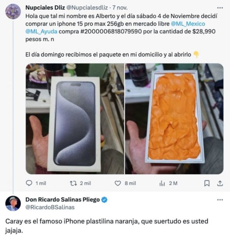 "Caray es el famoso iPhone plastilina naranja, que suertudo es usted jajaja", escribió Salinas Pliego.