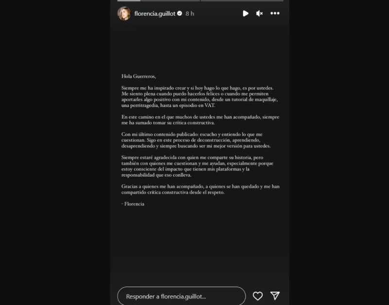Florencia Guillot reconoce que no a todo el mundo podrá gustarle su contenido en redes, sin embargo, recalca que no se lo toma personal y que, incluso si hubo seguidores que antes la seguían y a raíz de esta polémica la dejaron de seguir, entiende totalmente la situación.