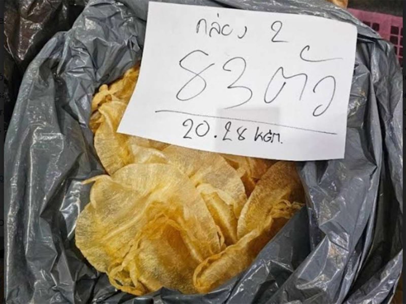 La Aduana del Aeropuerto de Bangkok en Tailandia decomisó poco más de 40 kilogramos de vejiga natatoria o "buche" de pez Totoaba seco y deshidratado, en un vuelo de conexión procedente de México, que llegó al país como "chispas de chocolate", con un valor en el mercado negro de 58 millones de baht, alrededor de dos millones 840 mil pesos mexicanos.