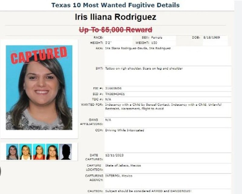Personal de Interpol México y de la Fiscalía de Jalisco capturaron a la exmaestra Iris Liliana Rodríguez -quien es requerida en Texas- por agredir sexualmente a una de sus alumnas de 12 años entre 2014 y 2015 en la comunidad de Webb.