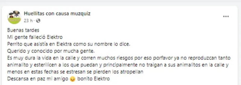 La cuenta de Facebook ´Huellitas con causa muzquiz´ compartió una publicación que conmocionó a muchos. Una imagen de Elektro acompañada de un mensaje desgarrador: "Querido y conocido por mucha gente. Es muy dura en la calle y corren muchos riesgos por eso por favor ya no reproduzcan tanto animalito y esterilicen a los que puedan y principalmente no traigan a sus animalitos en la calle y menos en estas fechas se estresan se pierden los atropellan".