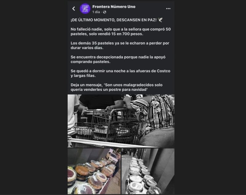Al parecer la mujer, de identidad desconocida, no pudo vender todos sus pasteles, de acuerdo a una publicación en redes sociales donde menciona que solo pudo vender 15 de los cincuenta pasteles que compró.