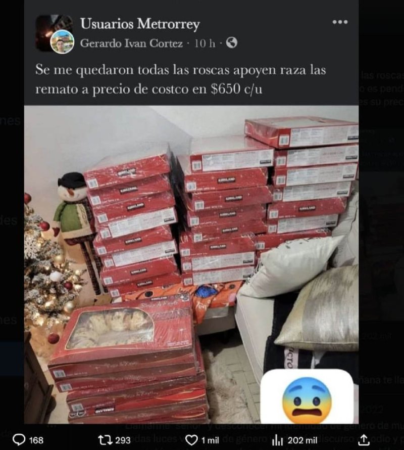 Es el caso de un joven, identificado con el nombre de Gerardo, que anunció el pasado 5 de enero del 2024, con bombo y platillo, que había logrado comprar decenas de roscas del Costco y por la demanda que presentaba ese pan pedía a la gente aprovechar sus ofertas, apartando con 150 pesos una rosca, para el día de la entrega quedar en un precio final de 900 pesos. El joven advertía en redes sociales que los precios de reventa de las roscas del Costco podrían llegar a los mil 200 pesos.