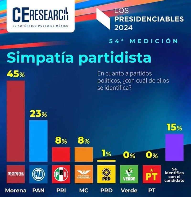 En cuanto a la preferencia partidista, Morena lidera con un 45%, seguido por el PAN con el 23%. El PRI y Movimiento Ciudadano comparten el tercer lugar con un 8%, mientras que el PRD tiene un punto. El PT y el Partido Verde se ubican en la parte inferior con cero simpatizantes, y el 15% restante se identifica con otros candidatos.