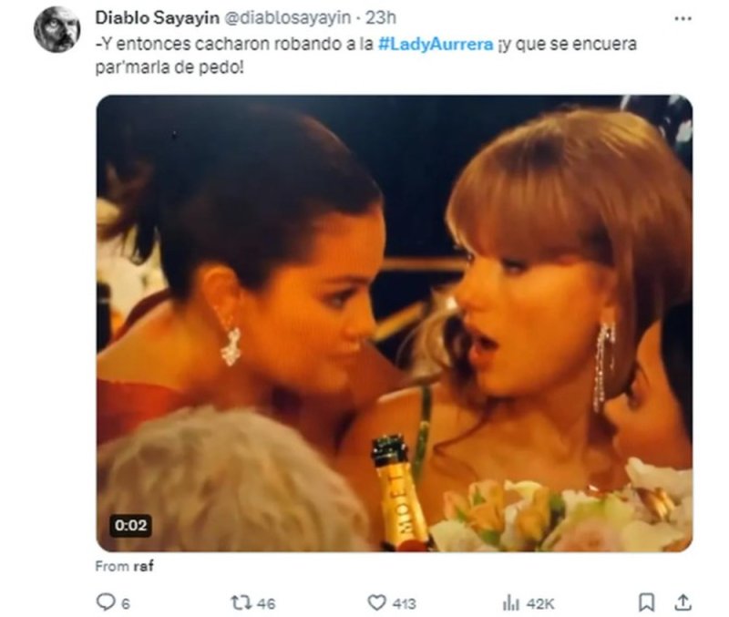Taylor Swift y su reacción con Selena Gómez en los Globos de Oro 2024, también se hizo meme, ya que hay muchos que no comprenden por qué Lady Aurrerá se quitó la ropa.