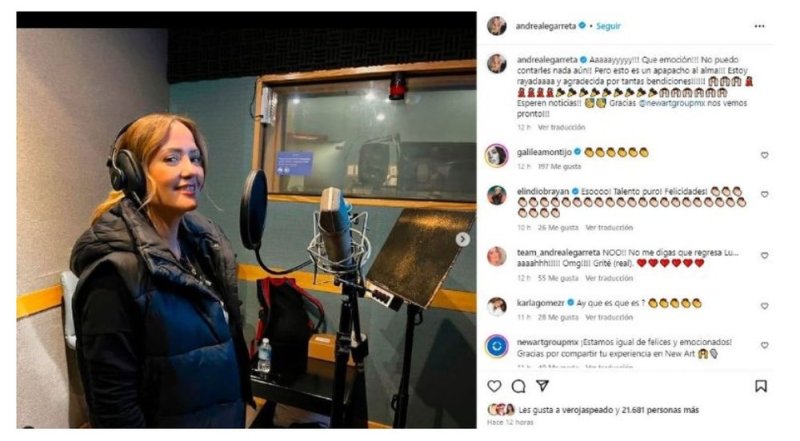 Fue a través de su perfil oficial de Instagram donde Andrea Legarreta anunció este nuevo emprendimiento en su carrera y aunque la presentadora de “Hoy” dijo estar más que emocionada señaló que todavía no podía ofrecer muchos detalles al respecto, sin embargo, lo que sí quedó claro es que este nuevo proyecto tiene que ver con la grabación de su voz y sus fans creen que podría tratarse de algún tema relacionado con el doblaje pues en ocasiones anteriores ya ha realizado este tipo de trabajos.