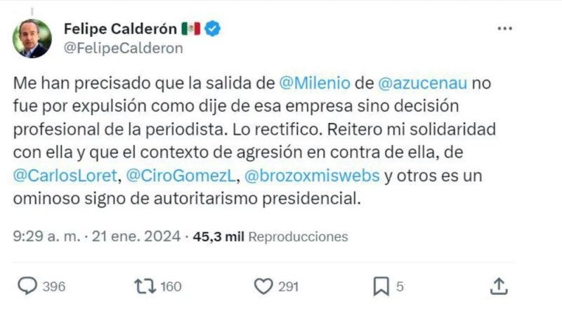 El expresidente Felipe Calderón se vio envuelto en polémica al difundir inicialmente noticias falsas sobre la salida de la periodista Azucena Uresti de Milenio.