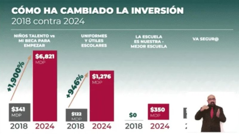 "Ya en esta administración, del 2019, al 2024, pasamos de 2 mil 918 millones de pesos, a 8 mil 848 millones de pesos, o sea que no se dio un gran salto, pasando de un sexenio a otro, sino que dentro de esta administración, durante este sexenio nunca dejó de aumentar la inversión para las escuelas públicas", manifestó el senador con licencia.