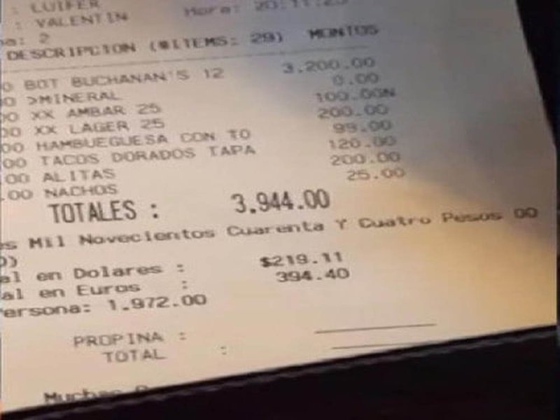 Al regresar a la mesa, se les entregó la cuenta, ascendiendo a 3,944 pesos mexicanos. Al realizar la división, el joven señaló que la cantidad por persona sería de 1,972 pesos (aproximadamente 103.46 dólares). En un giro inesperado, le pidió a la mujer que contribuyera con la mitad de la cuenta, añadiendo incluso el veinte por ciento de propina.